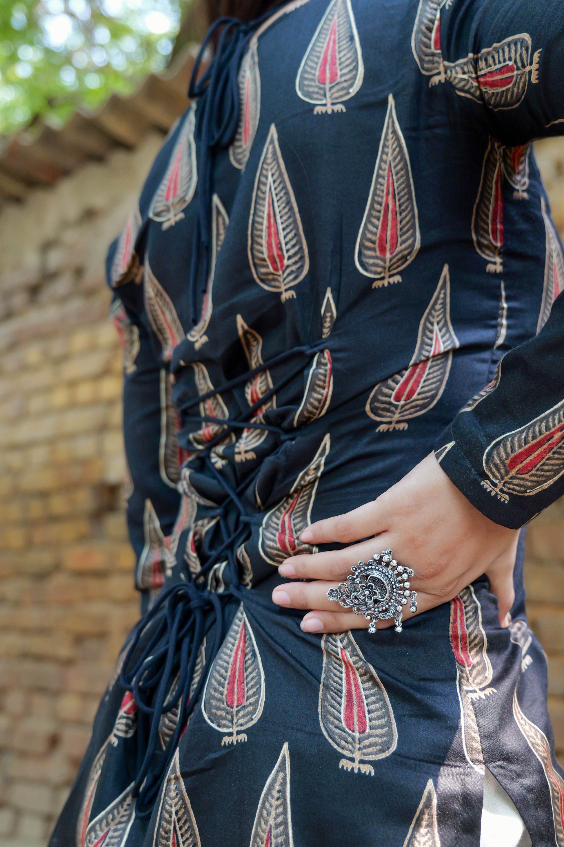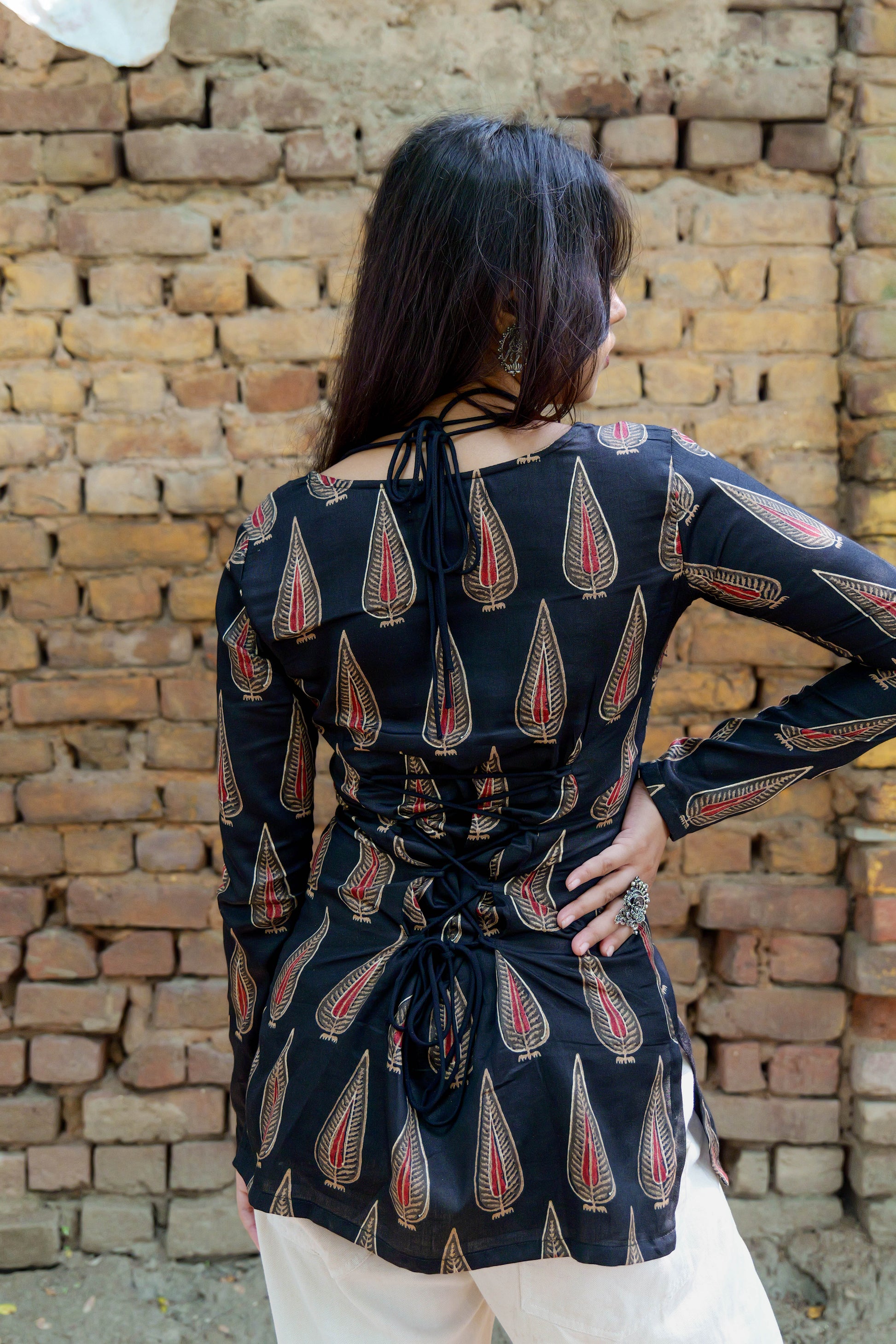 The Sundri blends tradition and bold charm with its striking hand-block print in earthy tones. Crafted from soft cotton, it features a flattering fit with long sleeves and a lace-up back that adds a modern edge. The delicate cut-out neckline enhances its appeal, making it perfect for days when comfort and style go hand in hand.