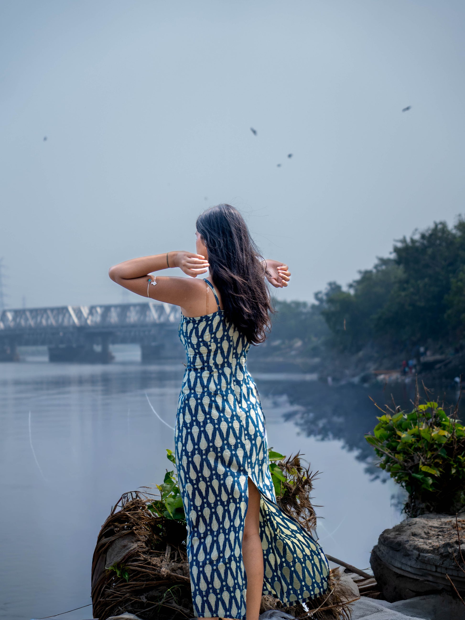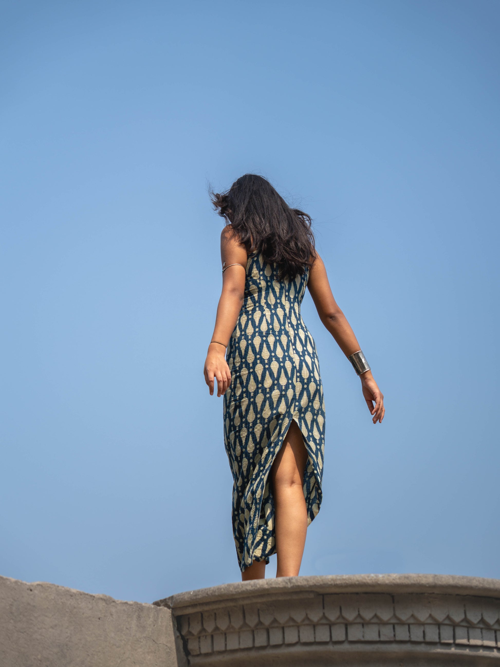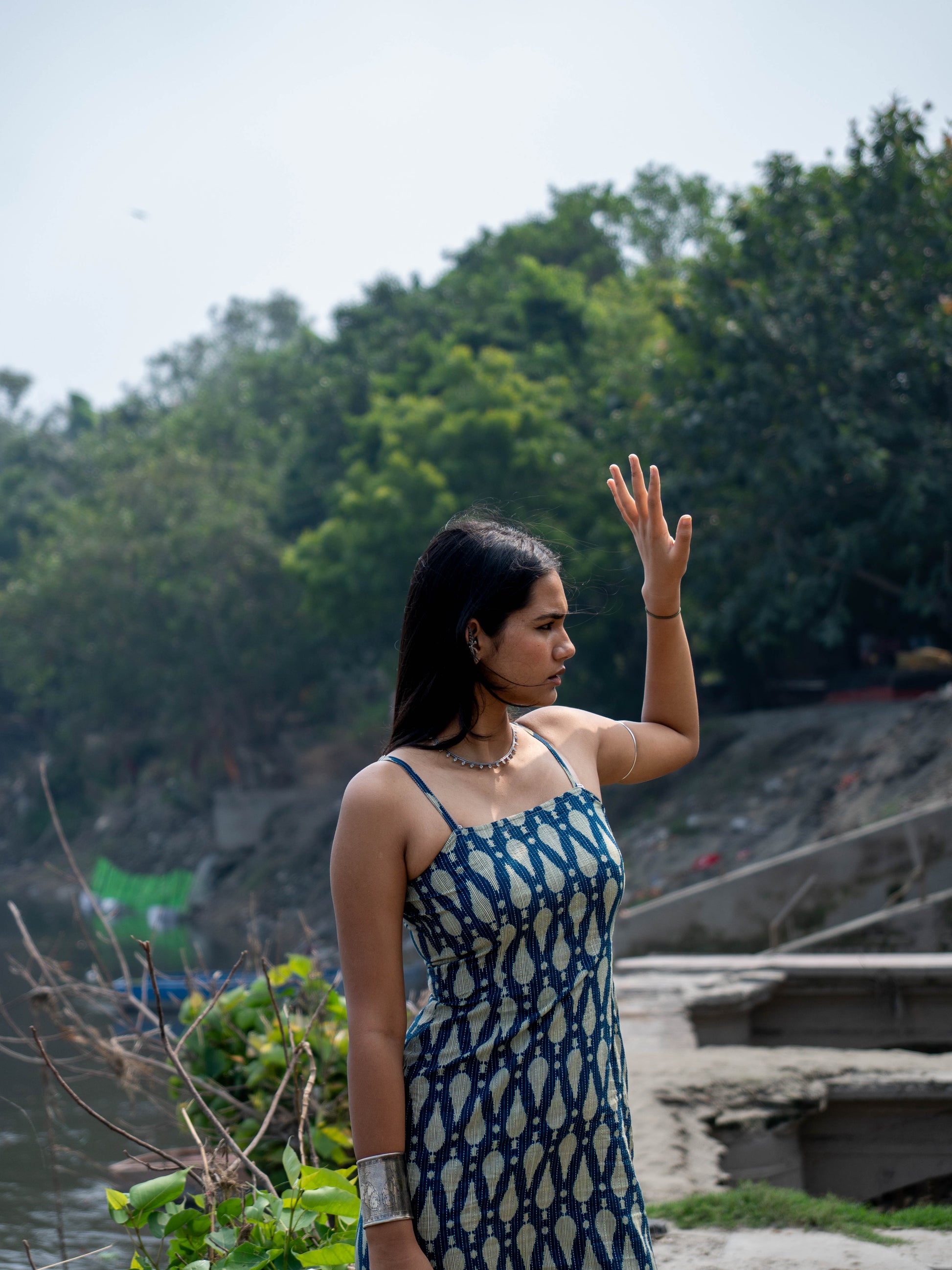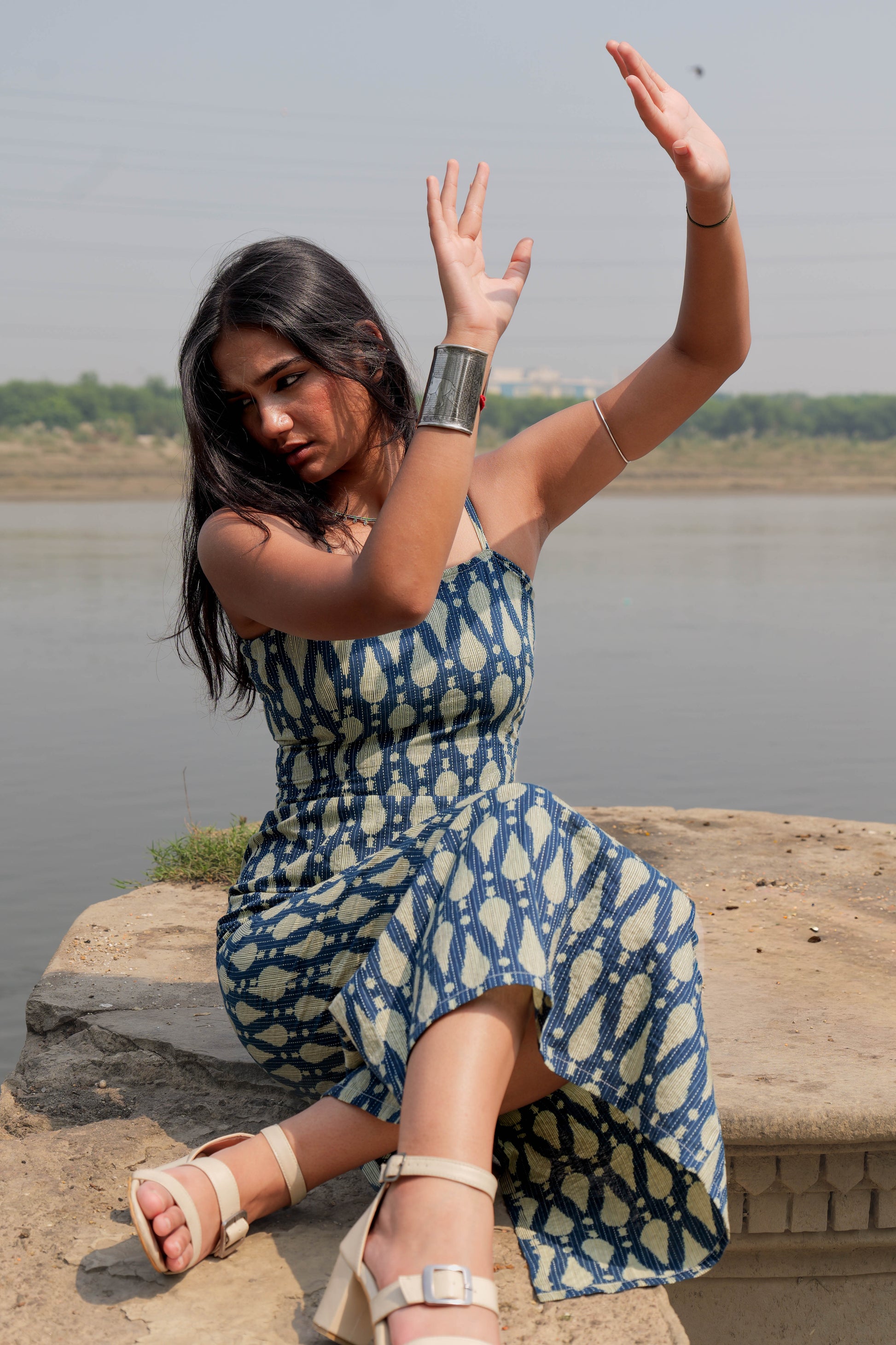 The Noor is where craft meets comfort. Handcrafted in pure cotton dress, this indigo beauty features a bold teardrop block print that captures the spirit of handmade artistry. Designed with slender shoulder straps and a relaxed silhouette, it’s your go-to piece for days that call for ease without losing style.